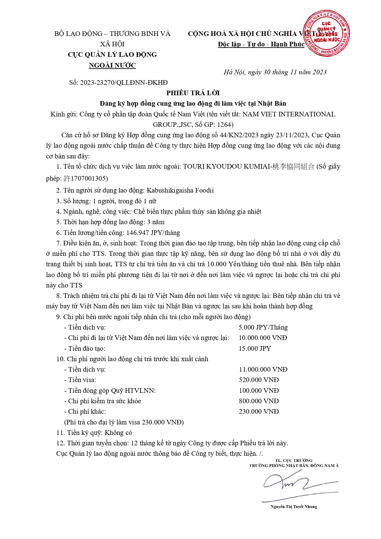 | 11 | Chi phí nộp cho công ty trước khi đi | Phí dịch vụ | 11.000.000 VNĐ/ 3 năm . | |